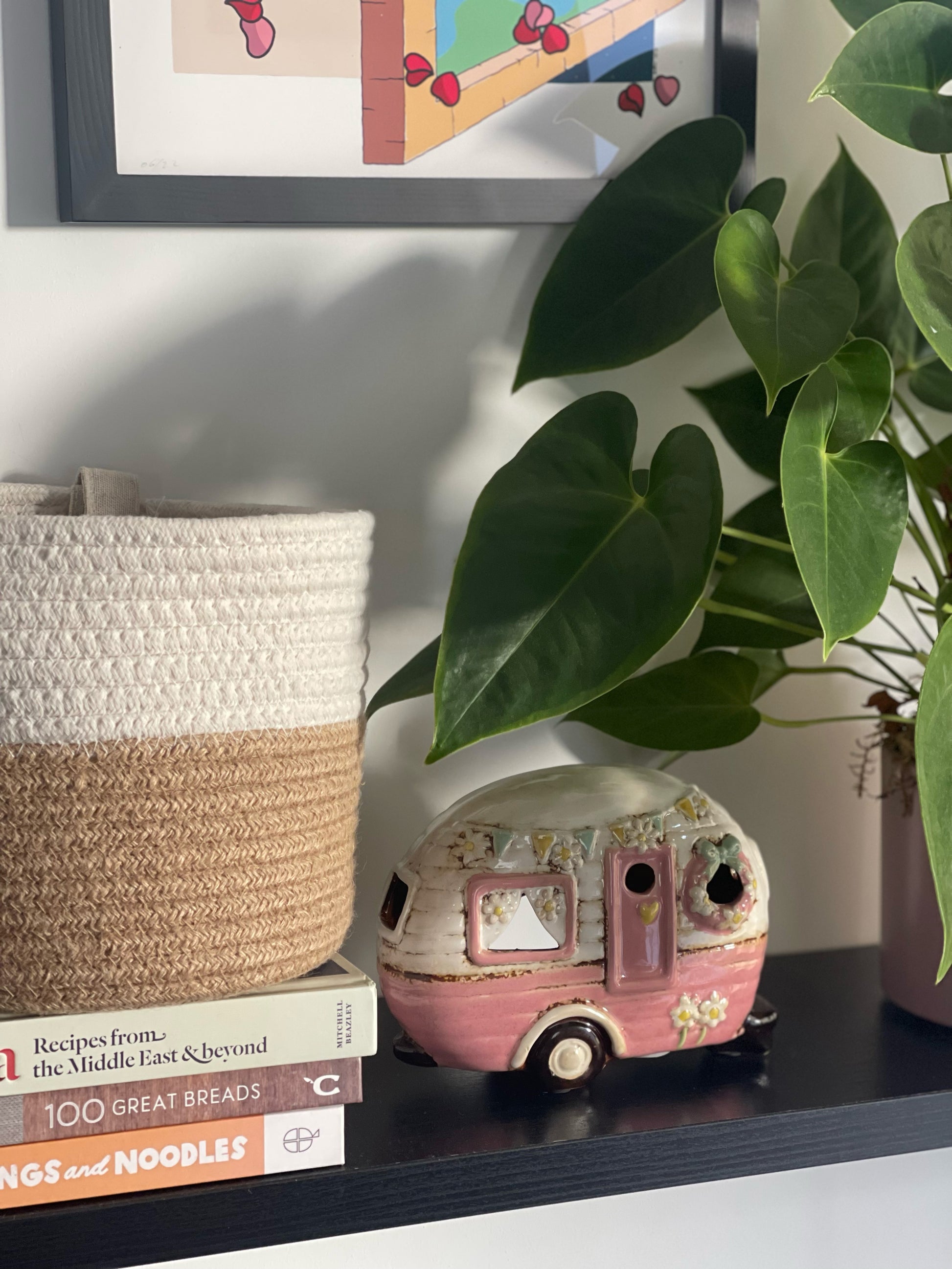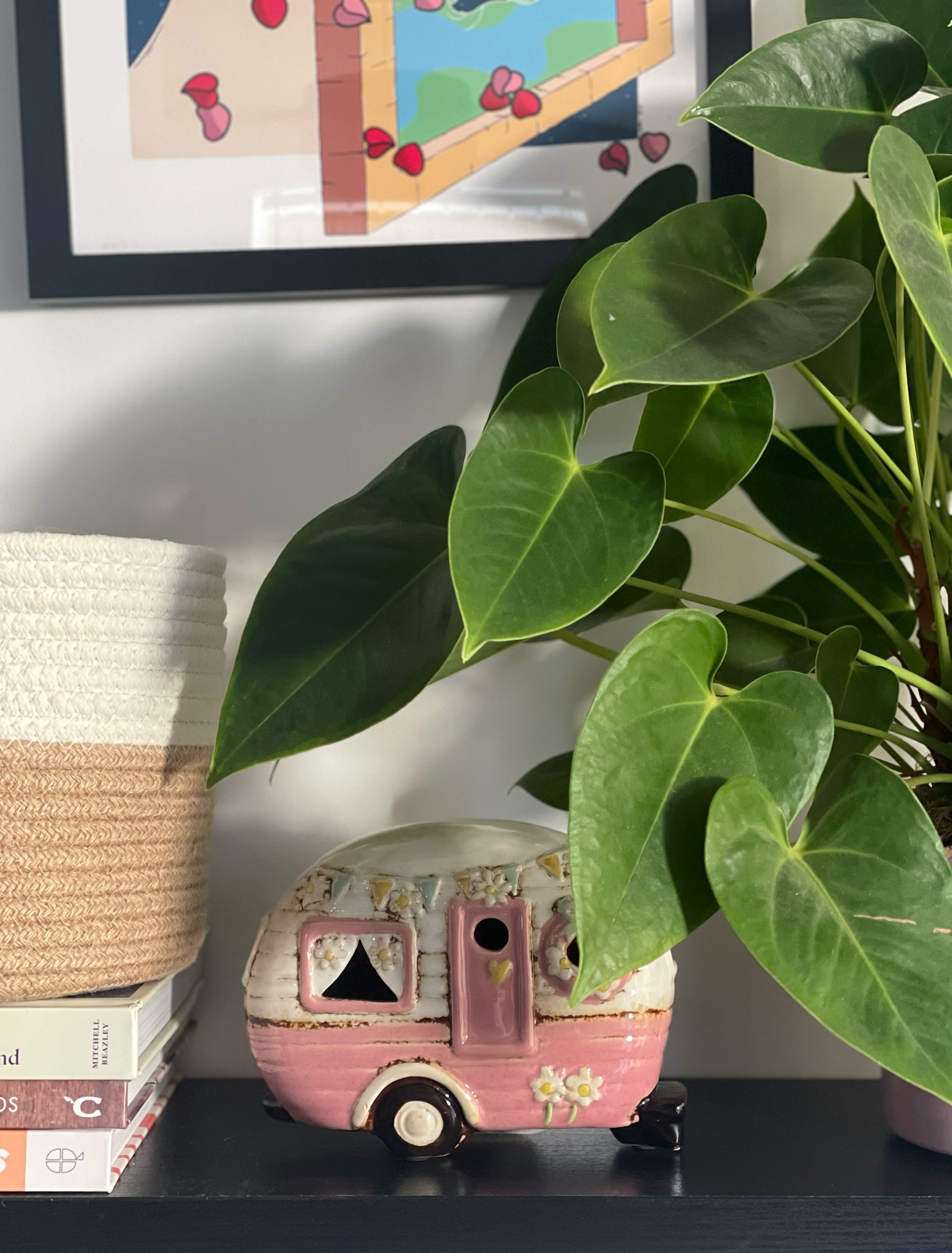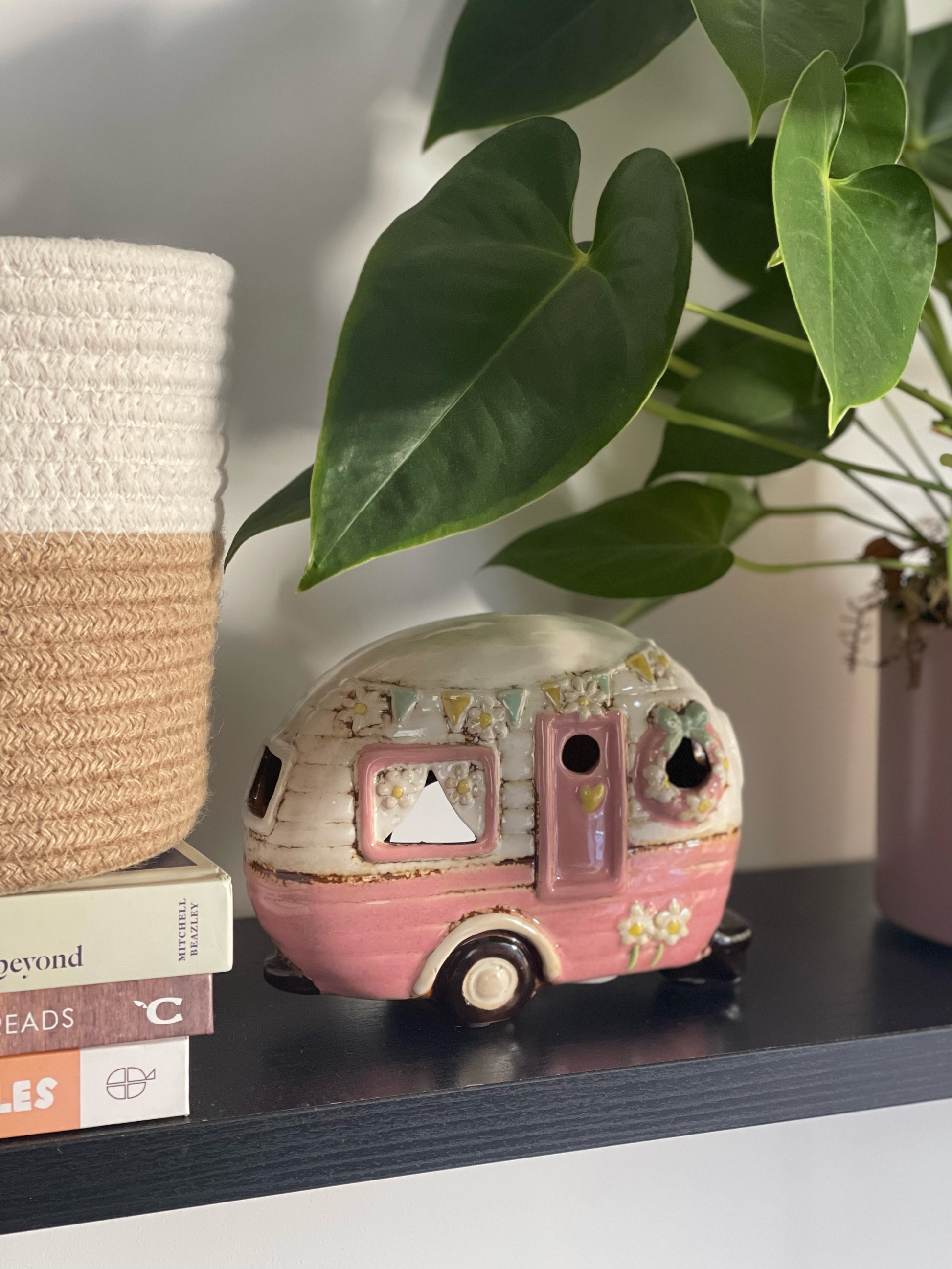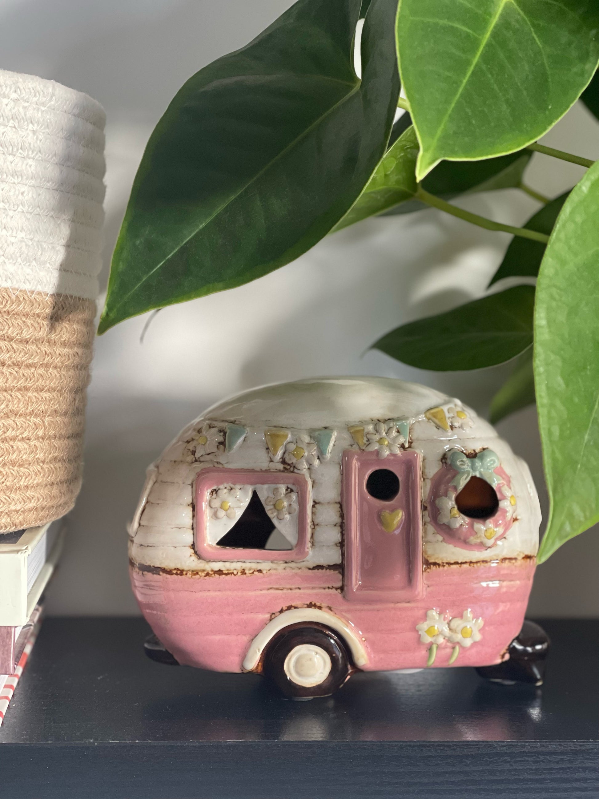 Brighten up any space with this charming Pale Pink Caravan Tealight Holder! Perfect for adding a cosy, vintage touch to your home décor, this ceramic tealight holder is shaped like a classic retro caravan, complete with delicate floral details, bunting, and an adorable wreath on the door. When lit, the soft glow shines through the windows, creating a warm, welcoming atmosphere. Ideal for living rooms, bedrooms, or as a unique gift for any camper or vintage lover, this tealight holder adds a nostalgic charm that brings warmth and personality to any setting.