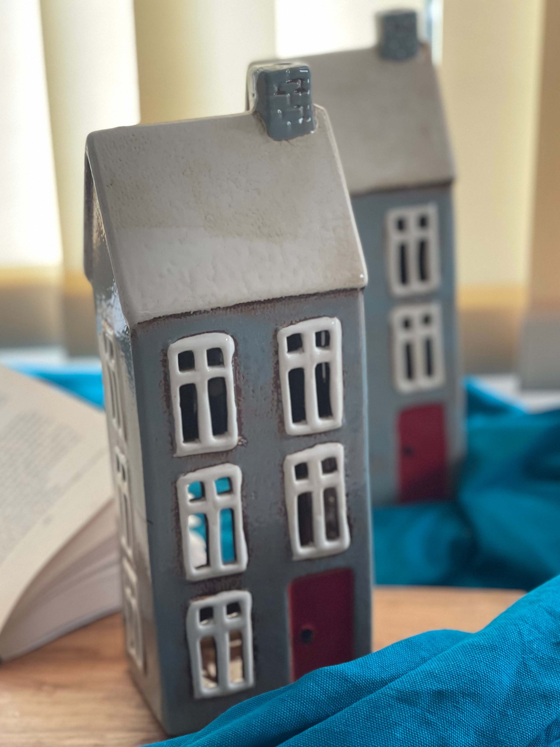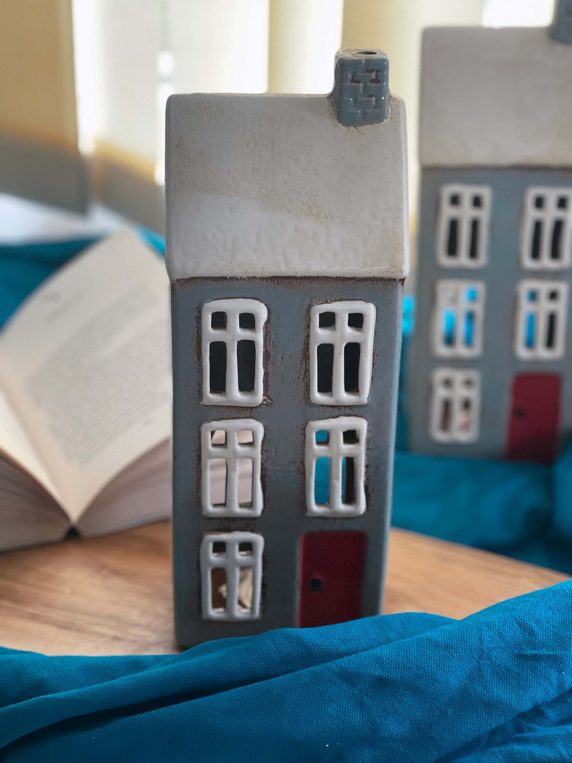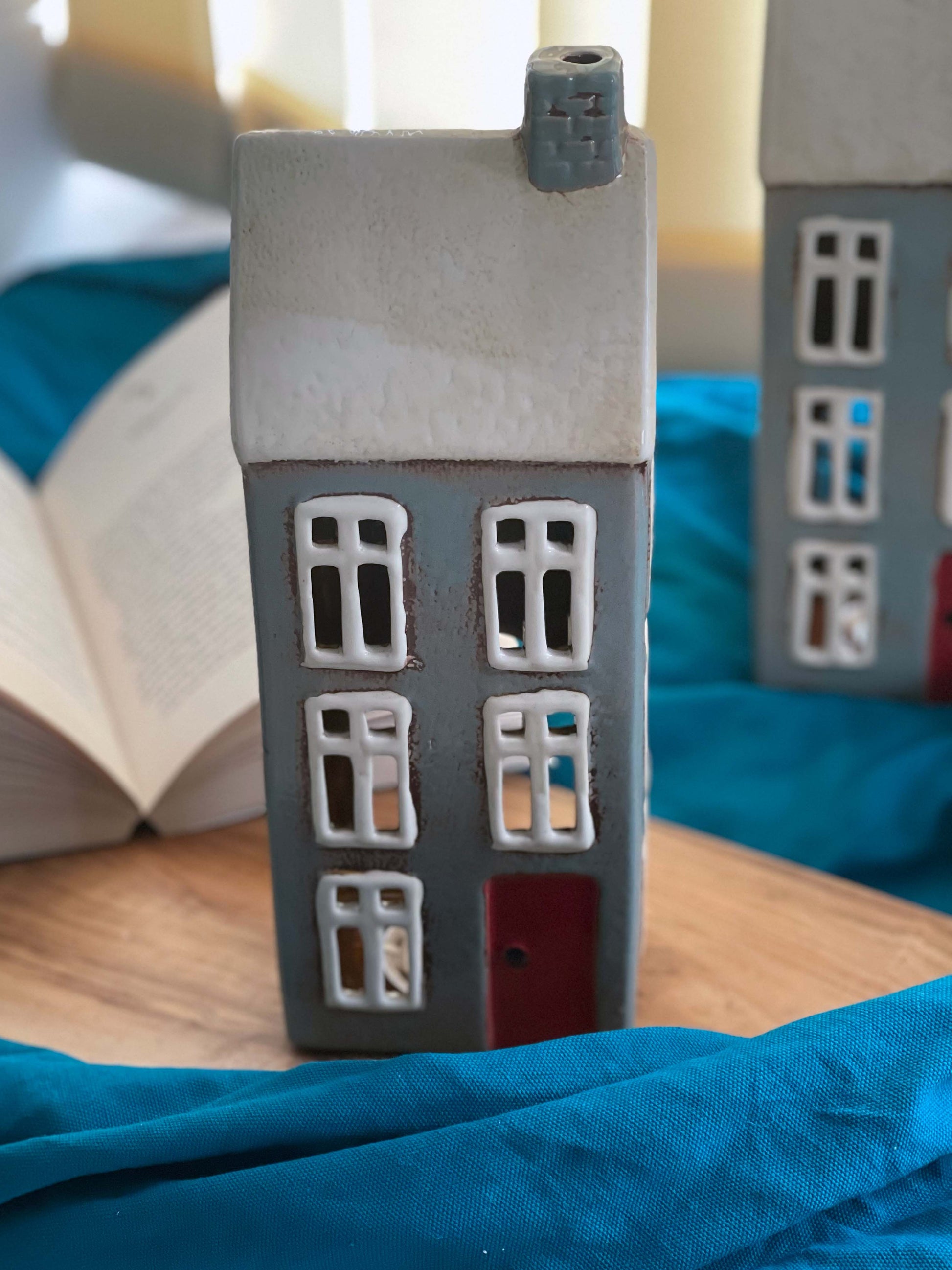 The Tall House Tealight Holder is a charming decorative piece that adds warmth and character to any setting. This delightful tealight holder is designed to resemble a quaint, multi-story house with intricate window cutouts that allow the soft glow of a tealight candle to shine through, casting a cozy and inviting light. The house is painted in a dark gray colour with a slightly distressed finish, giving it a vintage, rustic appeal. The roof and chimney are in a creamy off-white hue, adding a touch of elegance, while the front door is a vibrant red, providing a cheerful contrast. Ideal for creating a serene and homey atmosphere, the Tall House Tealight Holder is perfect for use in living rooms, bedrooms, or any space that could benefit from a touch of whimsy and light.