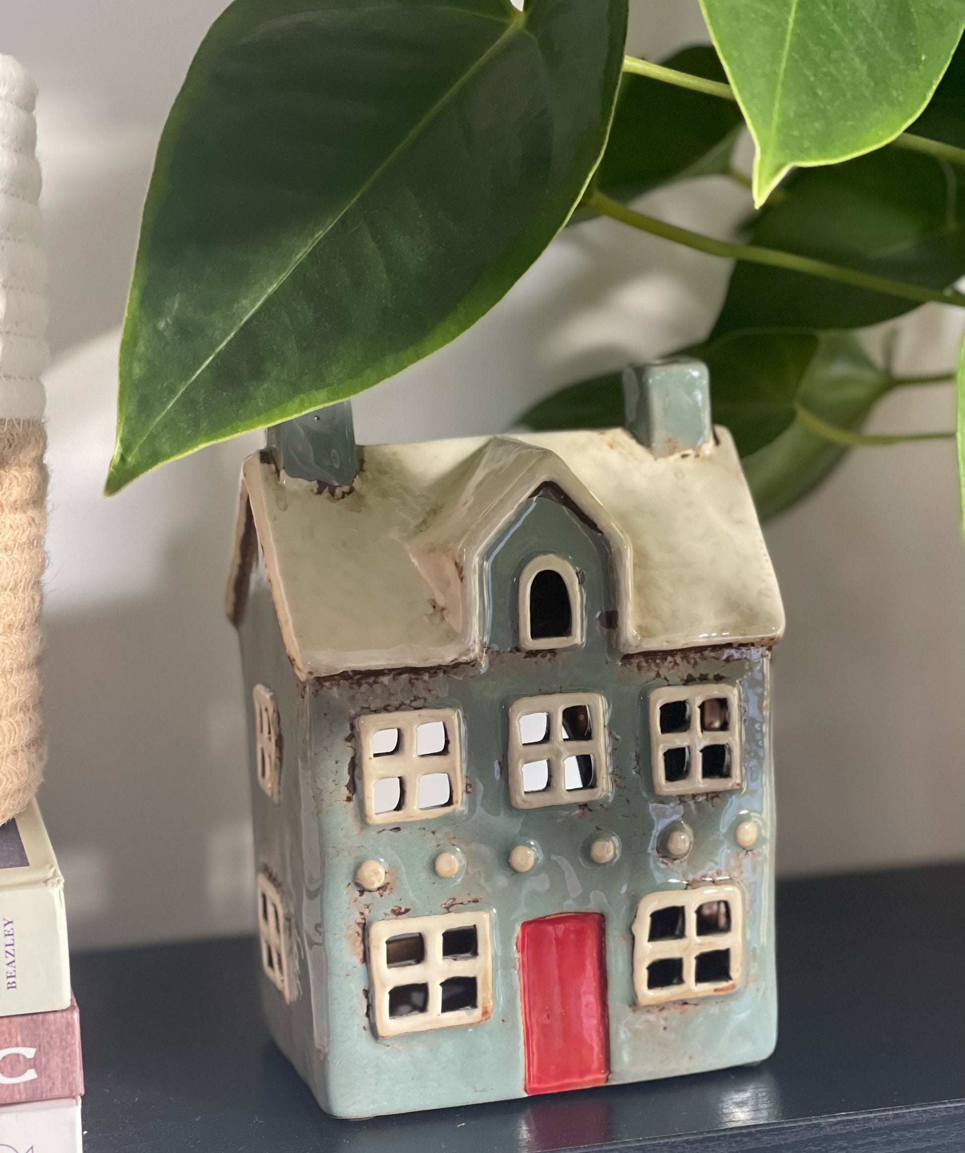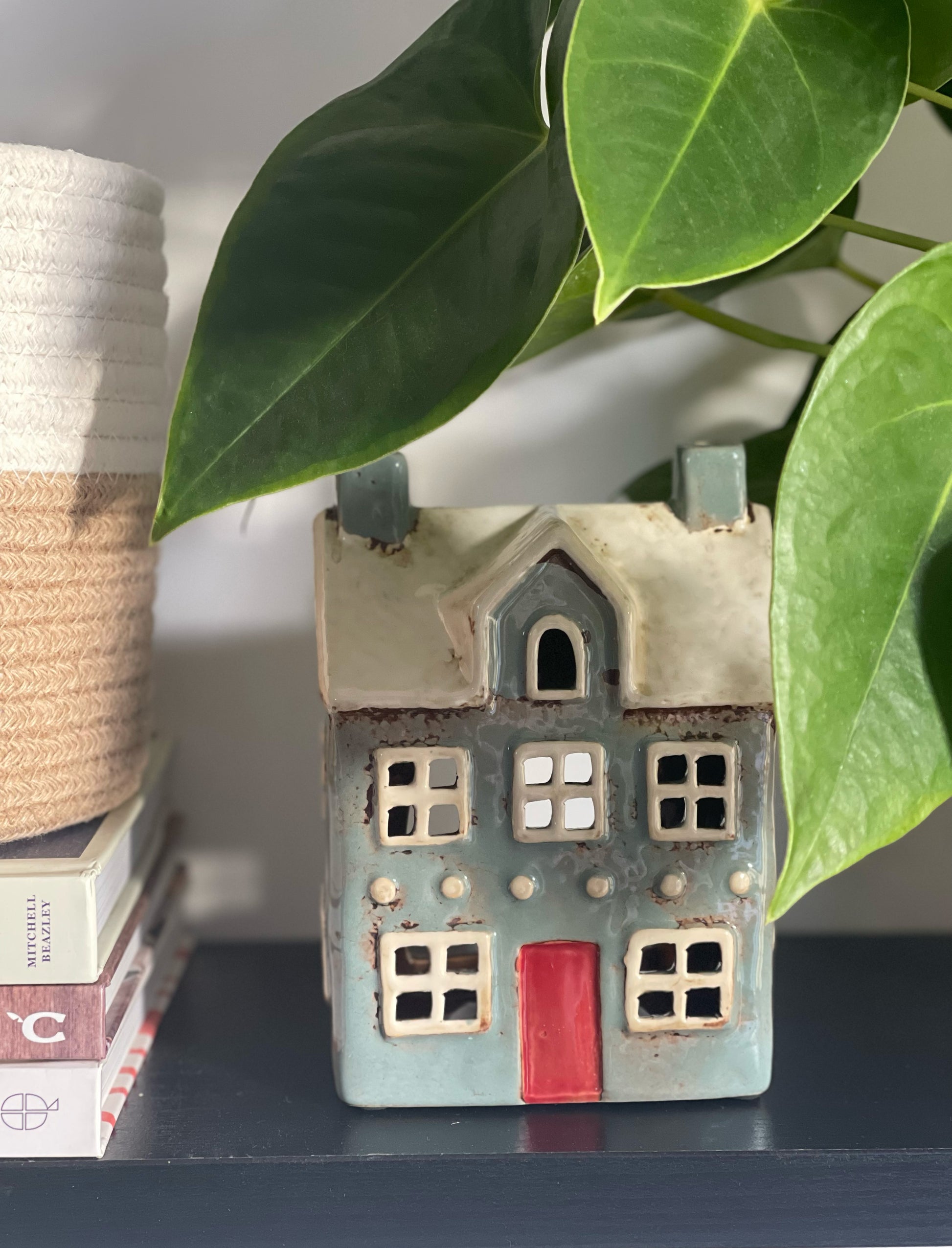 Enhance your home with the cosy charm of this traditional grey house tealight holder. Designed to resemble a classic home, it features soft grey tones, intricate window detailing, and a welcoming front door. When lit, the tealight casts a gentle glow through the windows, creating a warm, inviting ambiance in any room. Perfect for adding character to your décor or as a thoughtful gift, this tealight holder is a beautiful way to bring a touch of warmth to your evenings. Simply place a tealight inside to enjoy the comforting flicker from this quaint little house.